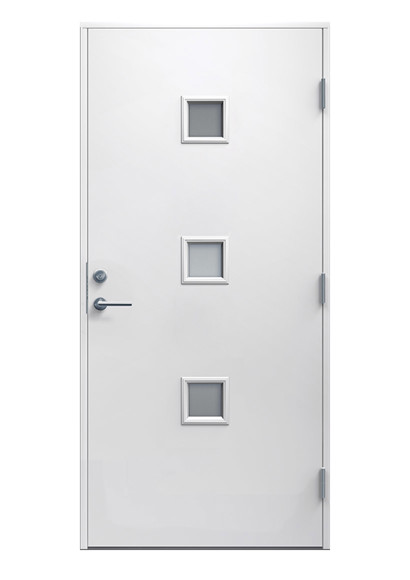 Vit ytterdörr med tre fyrkantiga glasöppningar